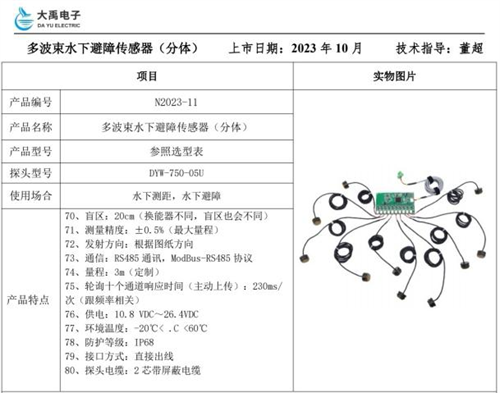 产品选型:综上所述,经和客户、公司技术沟通交流后,产品选用制造商为:福州大禹电子科技有限公司定制生产的:分体式水下避障传感器(10波束电路板),接4路探头(和电路板做快插连接,200KHz探头,每只探头1.5米长线缆),电路板集成到水下机器人内部做好防水封装,配50米线缆,线缆从机器人顶部穿出来防水封装,另一端做快插接头和手持式显示主机或电脑上位机软件显示出前、后、左、右分别的距离值和水下温度;